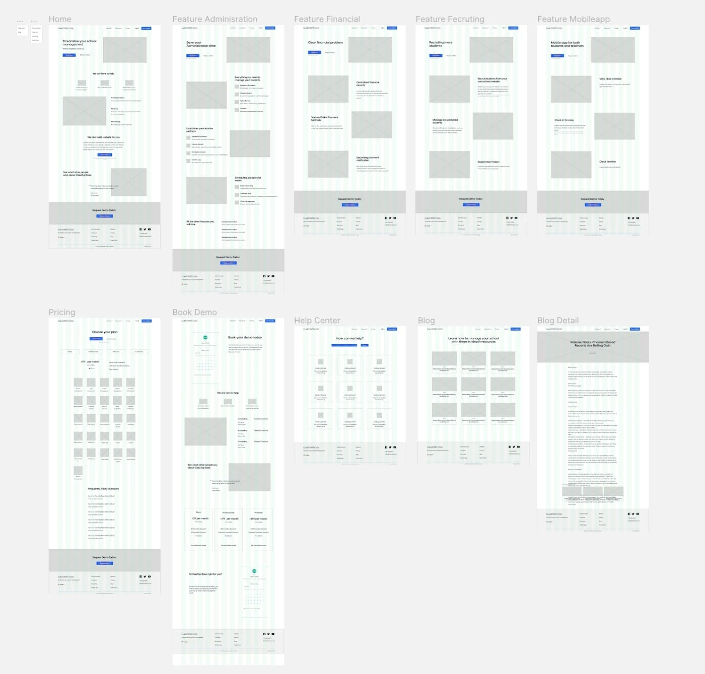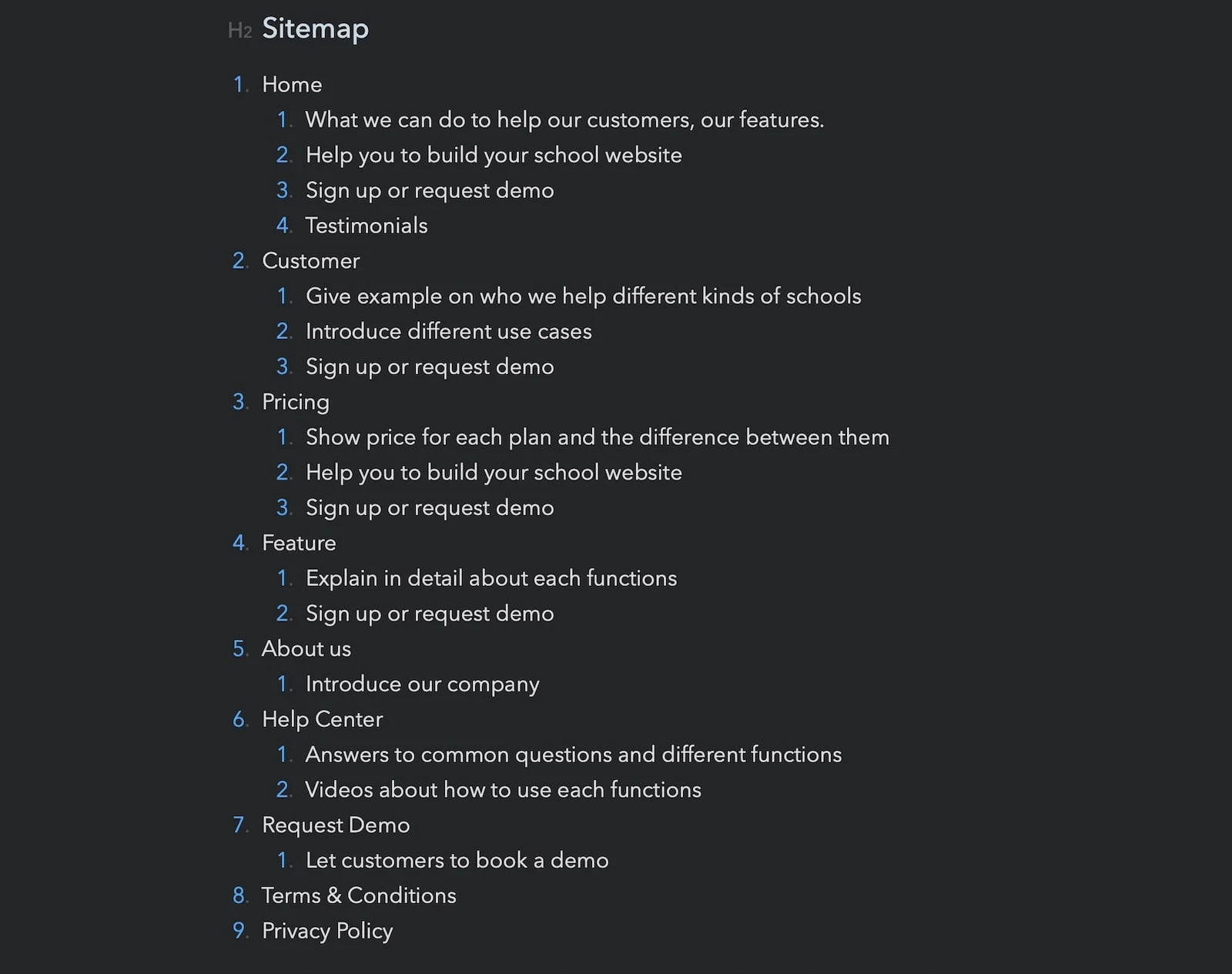 This was my first draft of the sitemap. I wanted visitors to know what problems our product can address and how to solve these problems. So in the case study section, It showcases how different schools use our products to help them. However, our users aren't as diverse as for now, and they are not interested in doing case studies. I had to drop the case study section and focus more on showing the features.